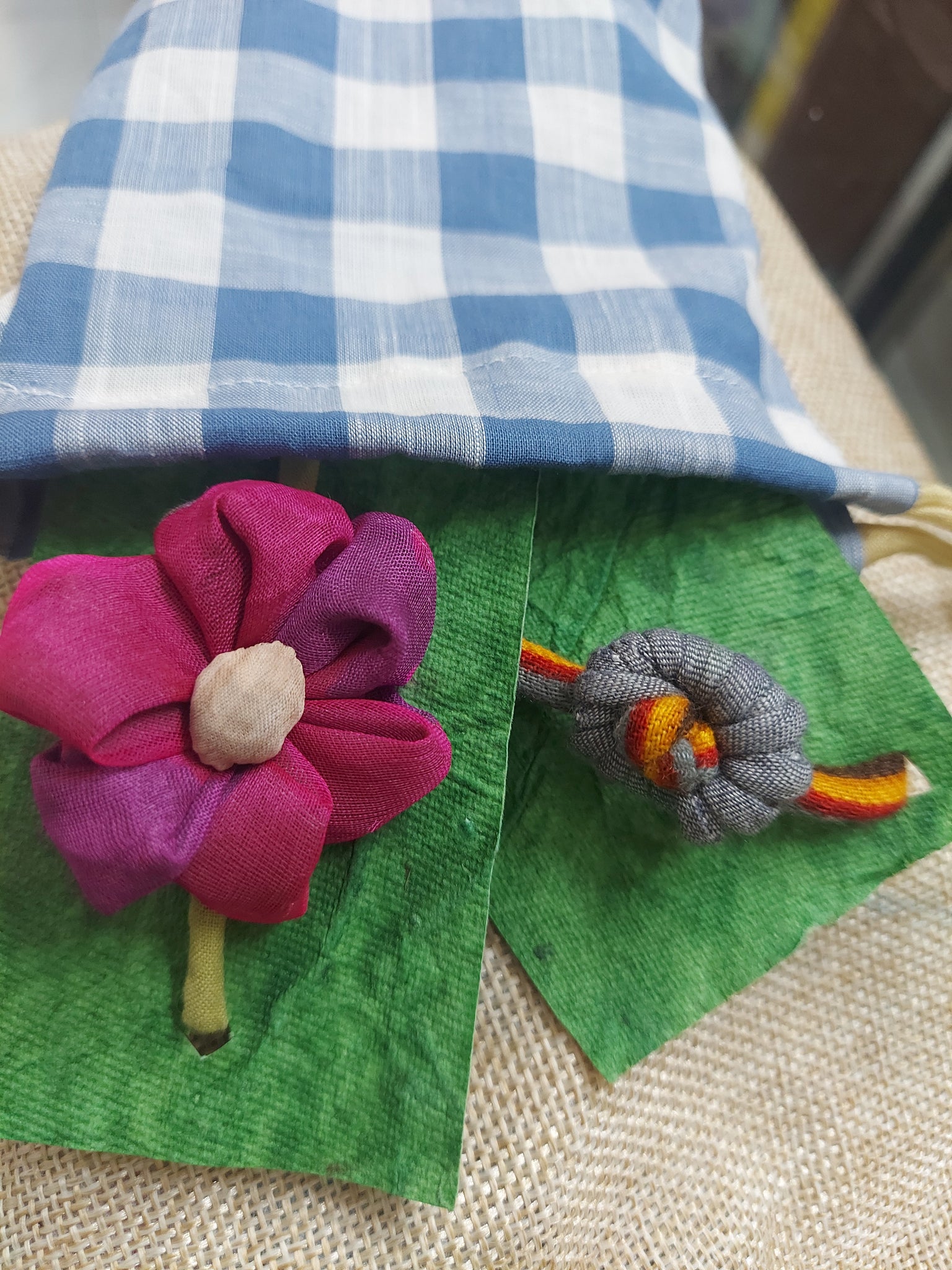 Pink floral sister rakhi is made of chanderi fabric. Brother rakhi is yellow orange combination dori rakhi is made of cotton fabric.