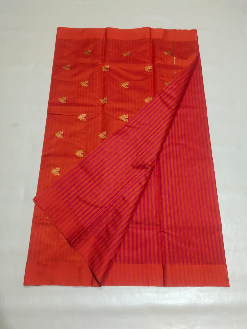 This exquisite Chanderi silk saree is a celebration of tradition and grace. Woven in a vibrant sunset orange hue, it features intricate golden floral and leaf motifs that shimmer across the fabric, lending it a regal charm. The subtle vertical stripes in gold and pink add depth and texture, enhancing its visual richness.