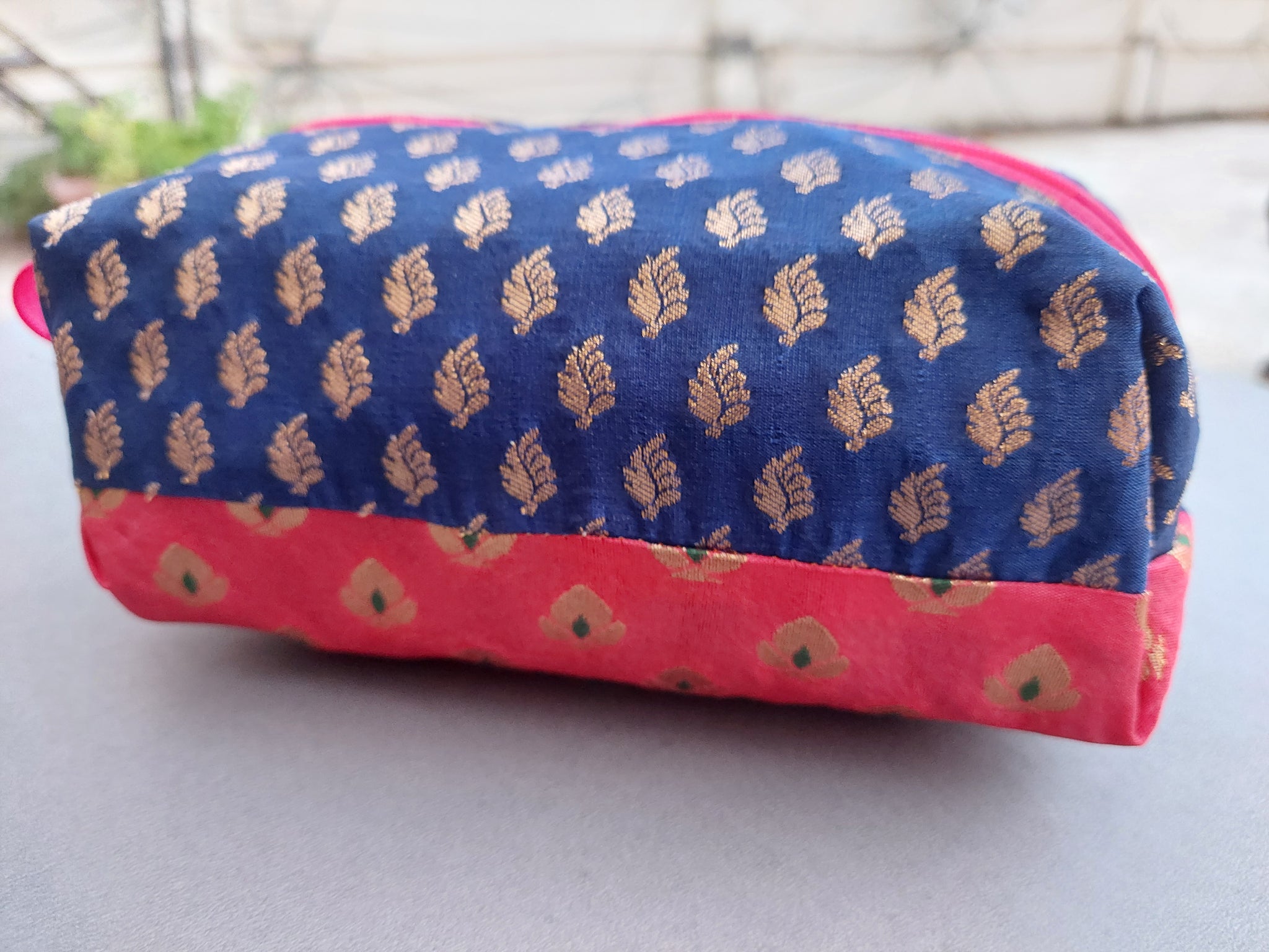 Bridal looking pouch made with pink and blue beneras contrast fabrics. Pouch has one main section.