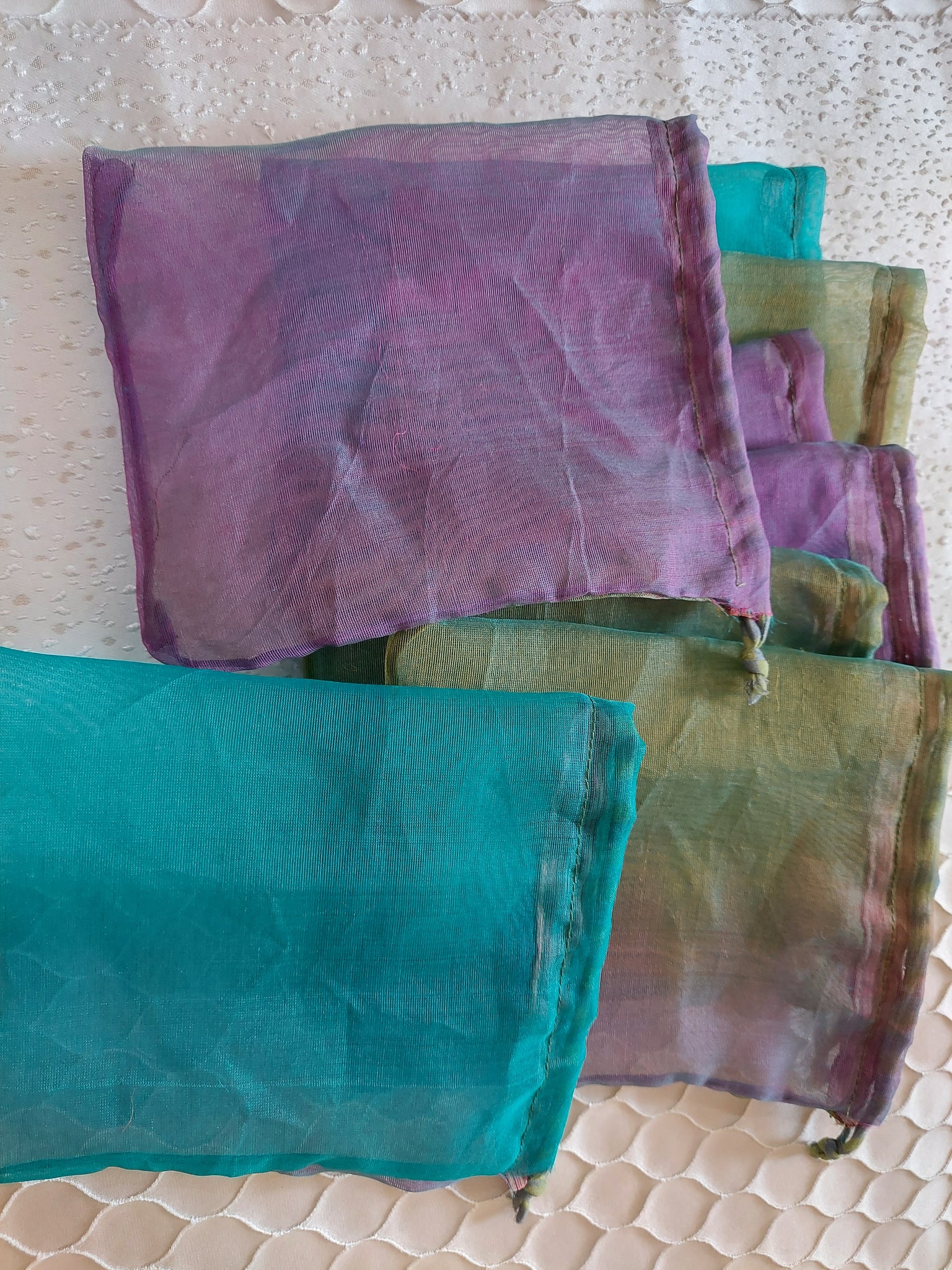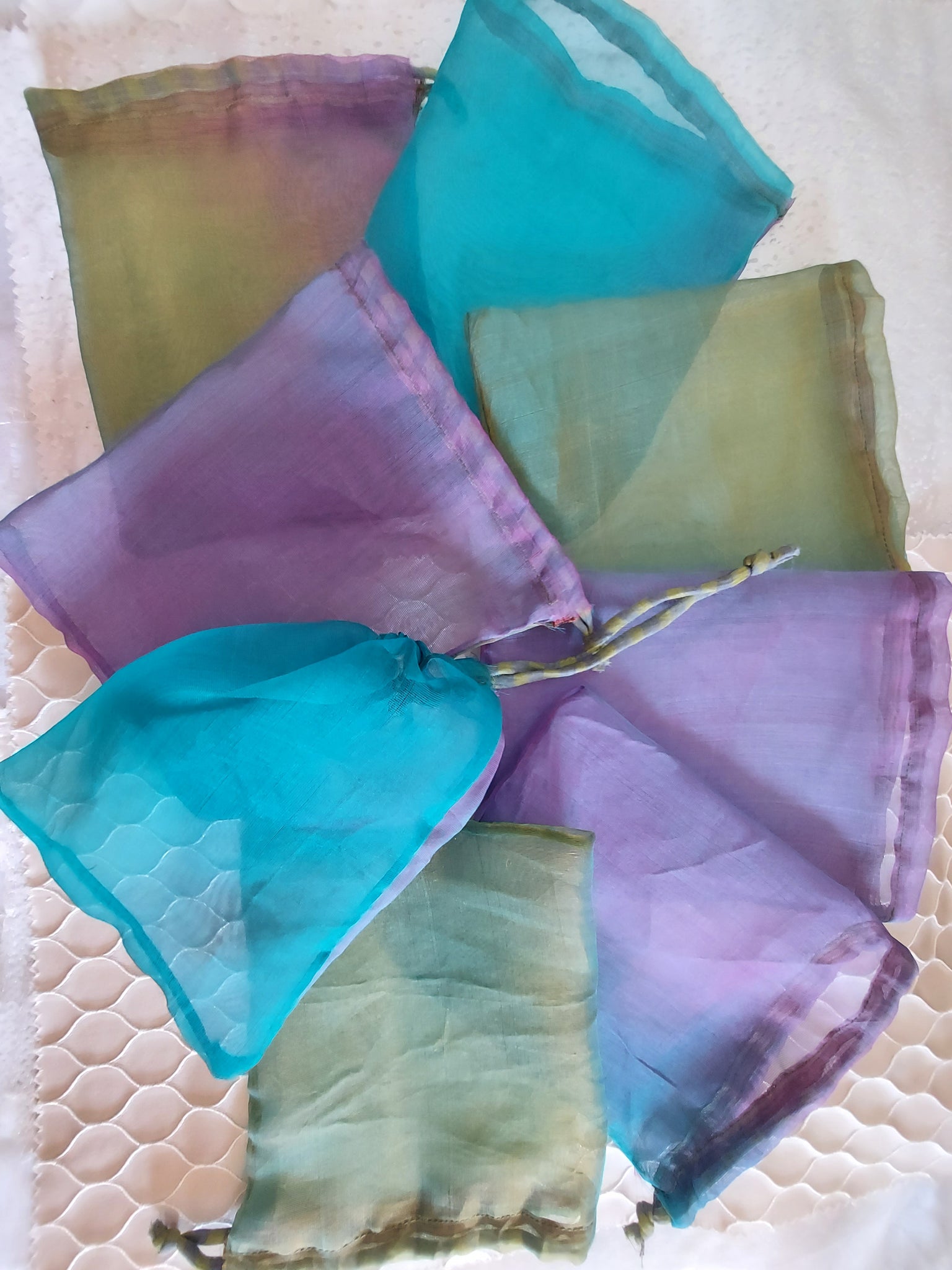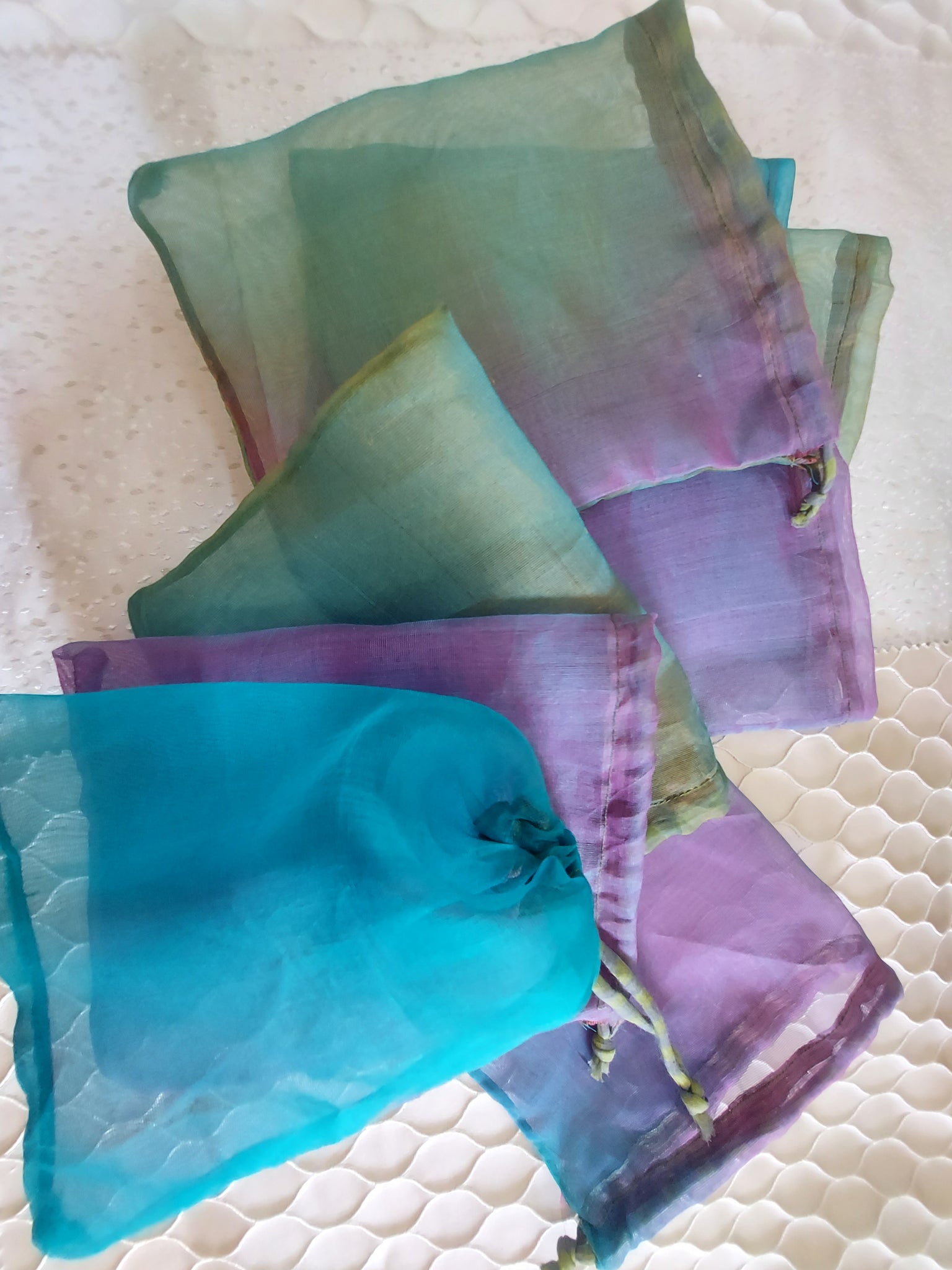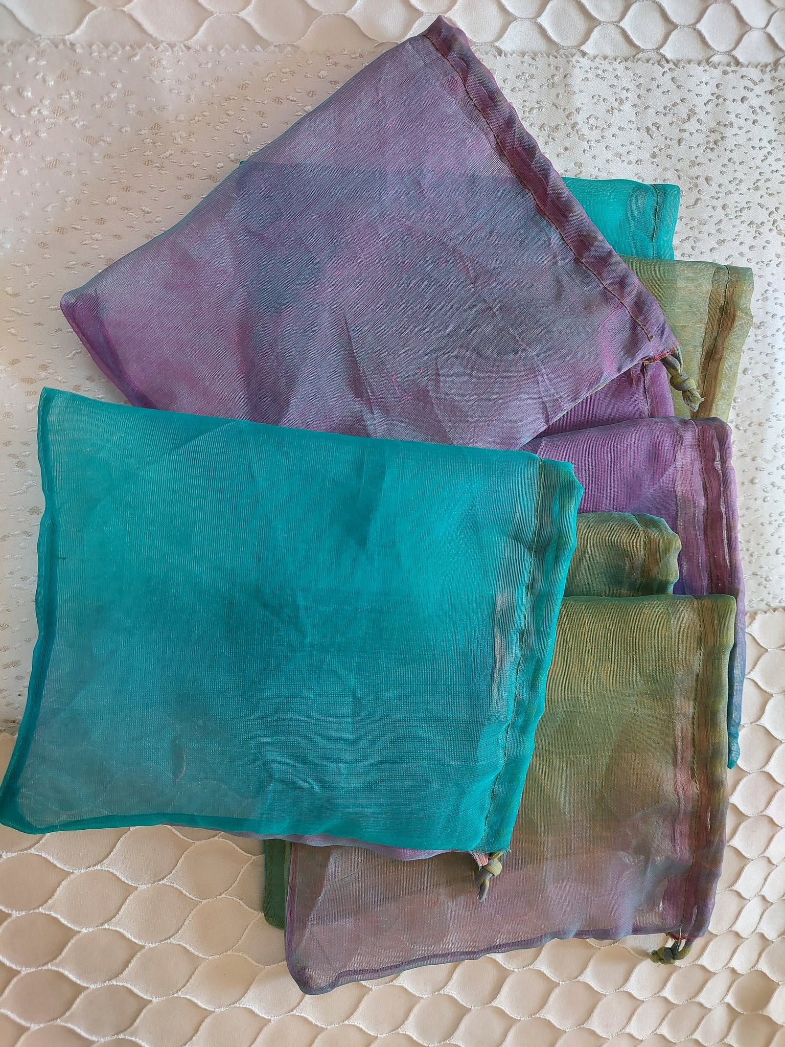 Made of organza fabric. It has one sided draw string. String has green and blue stripes.