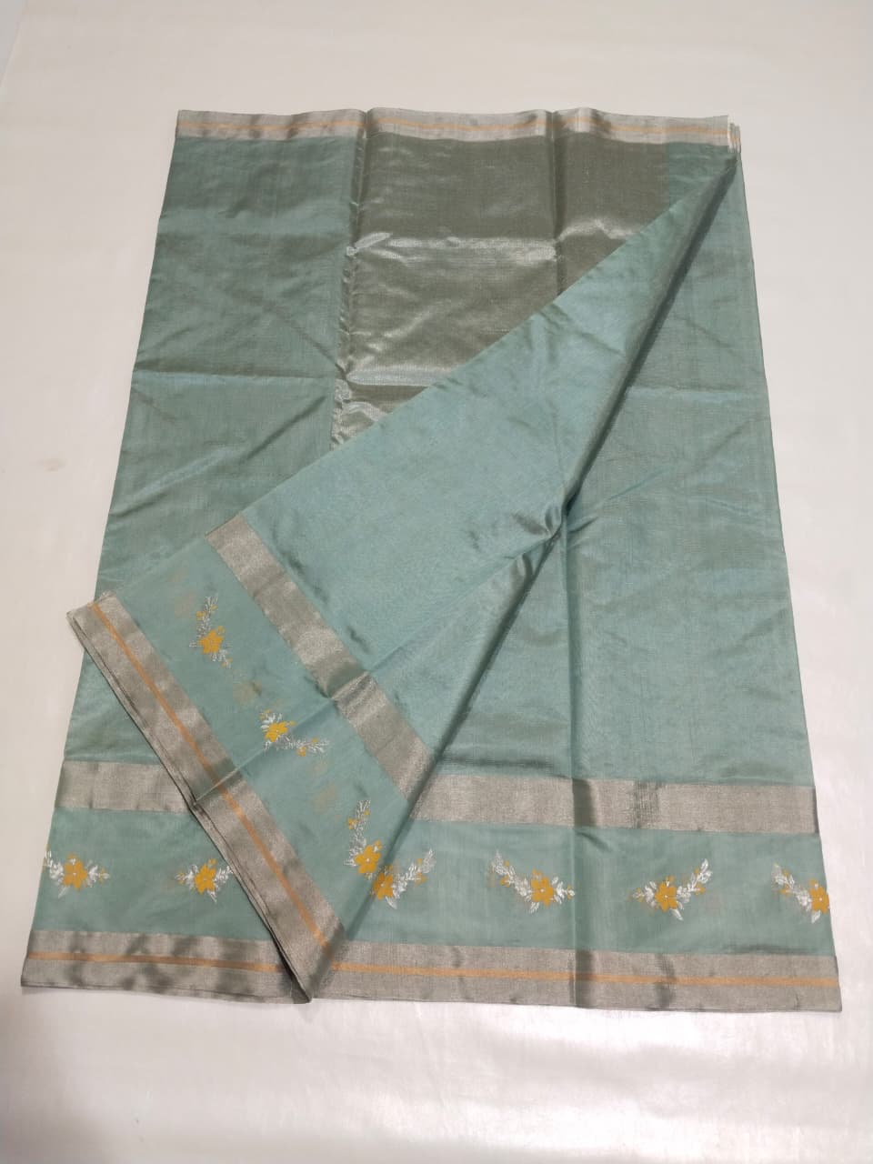 The highlight is its ornate silver border, adorned with delicate yellow and white floral motifs that add a touch of charm and sophistication. The border’s intricate design contrasts beautifully with the smooth body of the saree, making it a timeless piece of craftsmanship.